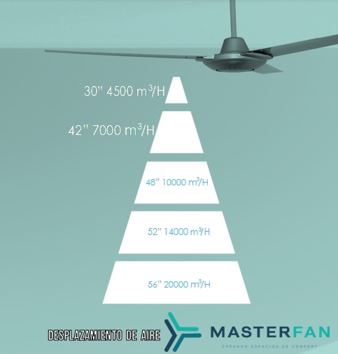La cantidad de aire que circula por un ventilador es determinada por el diámetro. Espacios grandes requieren de ventiladores con diámetros grandes, mientras que espacios chicos requieren un ventilador más pequeño.